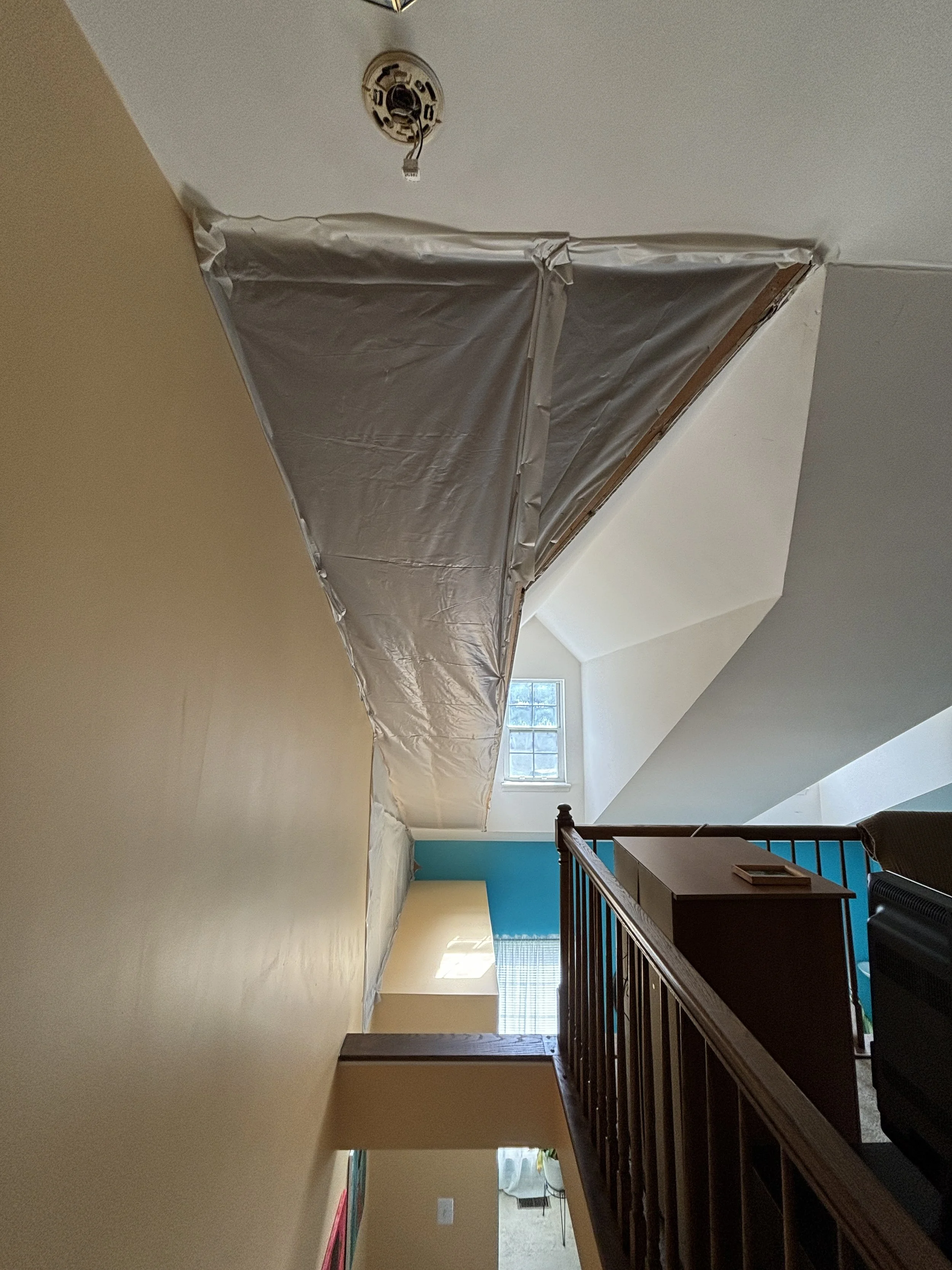 Our meticulous repair process begins with proper preparation. In this image, the ceiling drywall has been removed, and plastic sheeting is securely installed to prevent water intrusion and debris fall. This step ensures a clean and safe environment while setting the stage for flawless ceiling restoration. At Saint Restoration Services LLC, we take every precaution to deliver superior results